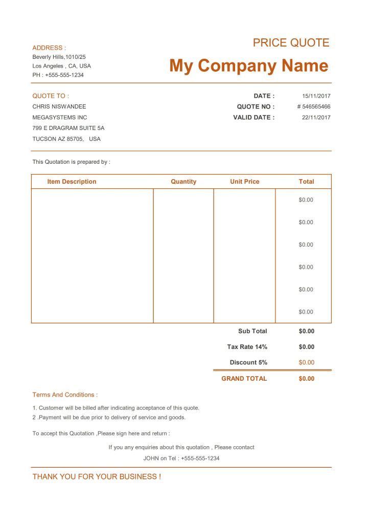 This template is designed for creating price quotations but can also be used as an invoice template. It features a fresh orange color scheme and includes a header with the seller's and buyer's information, a section for itemized products or services, and a summary of the total amount due.