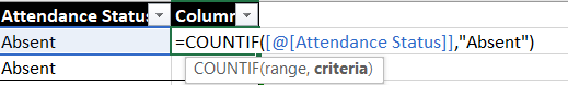 Use the same function to count when an employee's name appears in the 'Absent' column. It will give you the total number of days the employee was absent.