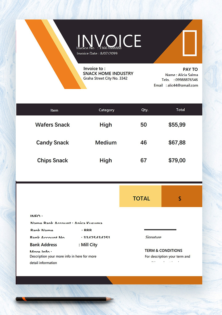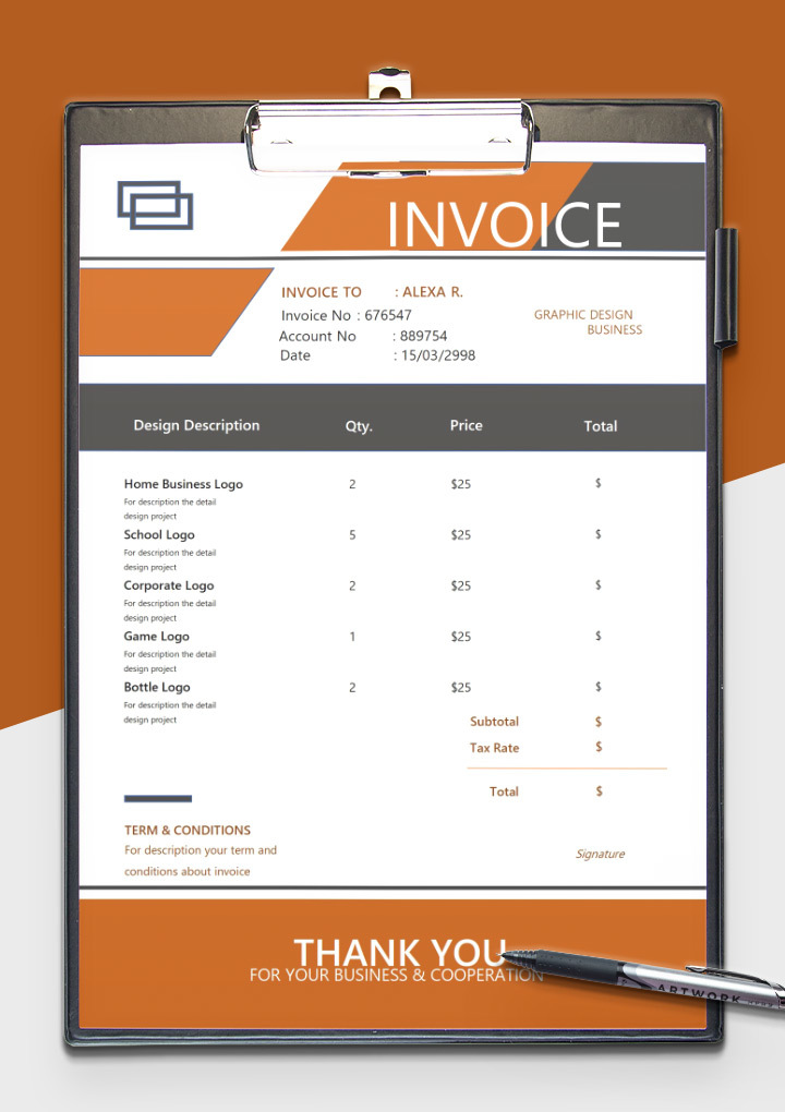 This template is excellent for businesses that want to add a touch of personality to their invoices. The red and white color scheme is eye-catching and unique, and the abstract design adds a sense of creativity.