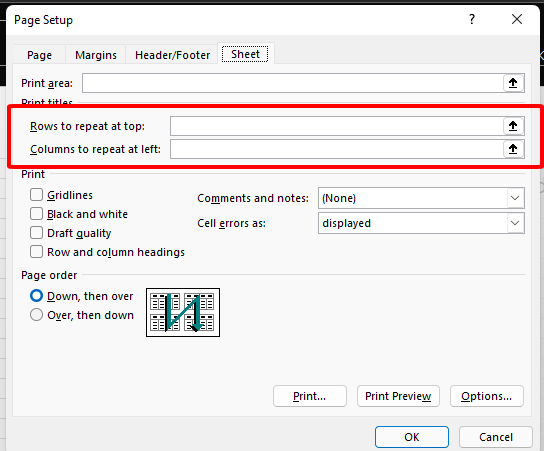 Step 3. In the "Sheet" tab of the "Page Setup" dialog box, locate the "Rows to repeat at top" field.