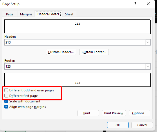 Step 4: If necessary, uncheck "Different First Page" and "Different Odd & Even Pages" options.