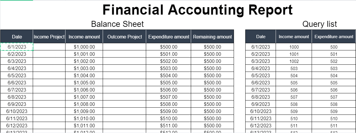 A simple but detailed dataset of income and expenditure. This is ideal for your day-to-day primary bookkeeping.