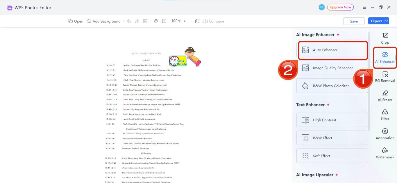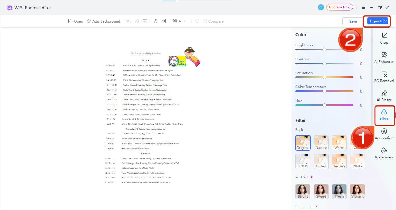 If you want to enhance the quality or adjust the colors of your preschool schedule, you can easily do it using WPS Photo.