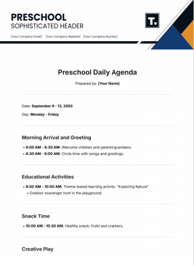 Preschool Daily Agenda [PDF, PNG] is pretty similar to the preschool lesson plan with activities, as it has headings with their timing and descriptions written below, making it convenient and easier for teachers and parents to understand.