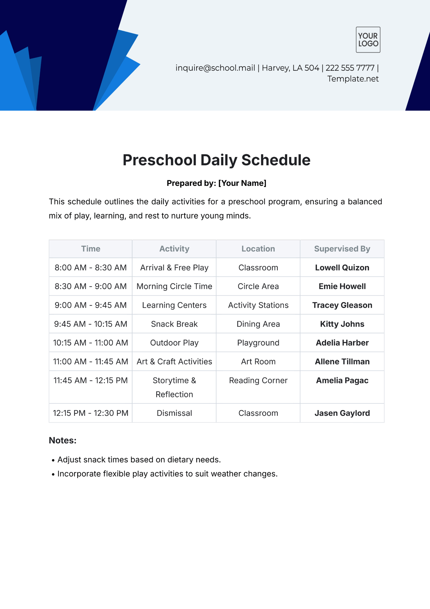 Free Daily Preschool Planner Template is a customizable preschool schedule template. It has a very elegant and decent design, making it pleasant to read.