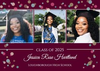 The Polka Decoration template shows playful polka dots against a gentle background. This captures the joy of graduation. Featuring three framed pictures, it highlights the graduate's journey. The prominent "Class of 2025" wording and the graduate's name make their accomplishment noticeable. Ideal for high school, college, or university graduations, this template produces a treasured memento for relatives and friends.
