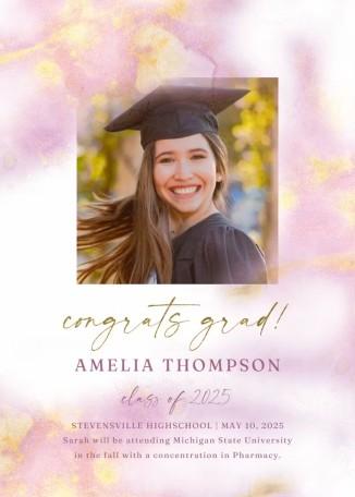 The Pink Abstract Watercolor template showcases gentle pink and peach watercolor shades, highlighted with sparkling gold for an elegant finish. Its stylish layout highlights your achievements with contemporary, crisp typography for your name, graduation date, and future aspirations. Ideal for any graduate, this premium, double-sided card accompanied by matching envelopes offers a memorable method to celebrate your achievement with family and friends.
