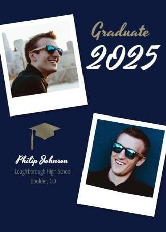 The Golden Hat graduation announcement design merges sophistication with contemporary flair. The rich navy blue background color and golden highlights produce an elegant appearance. The striking "Graduate 2025" wording grabs attention. Two polaroid-style picture frames provide a stylish accent, while your custom information is showcased with a simple graduation cap symbol. Ideal for graduates seeking to combine classical style with modern sophistication.