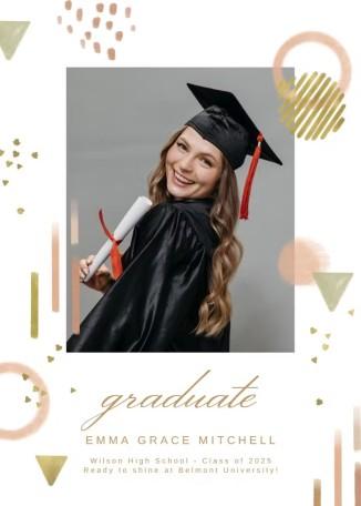 The Abstract Pastel Decoration template gives off a unique vibe. It combines gentle peach, mint, and gold for a soothing and welcoming appearance. Geometric forms such as triangles and circles provide a modern flair. In contrast, the gold highlights introduce a fresh, up-to-date vibe. The graduate written in cursive introduces sophistication and festivity, while the bold typeface for the name guarantees clarity and emphasis. This design achieves an ideal equilibrium between elegance and contemporary style, exuding a lively and fresh essence