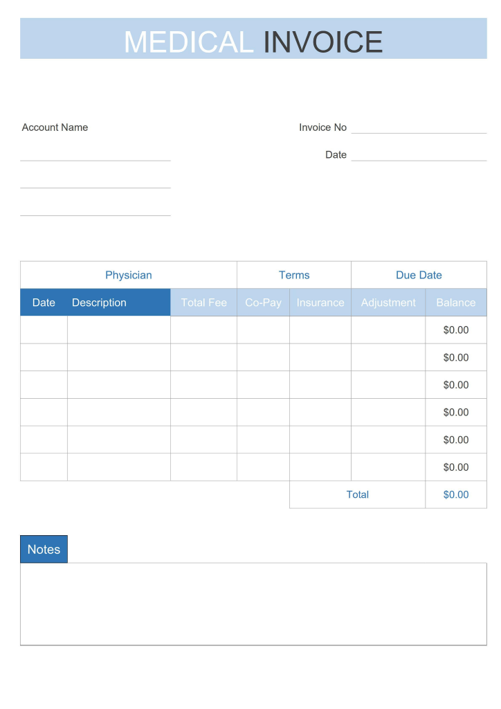 The Simple White&Blue Medical Invoice is a basic invoice template that medical professionals can use to bill their patients for medical services. The template features a clean and professional design and includes fields for the Patient's name and address, the medical services provided, the cost of each service, and the total cost.