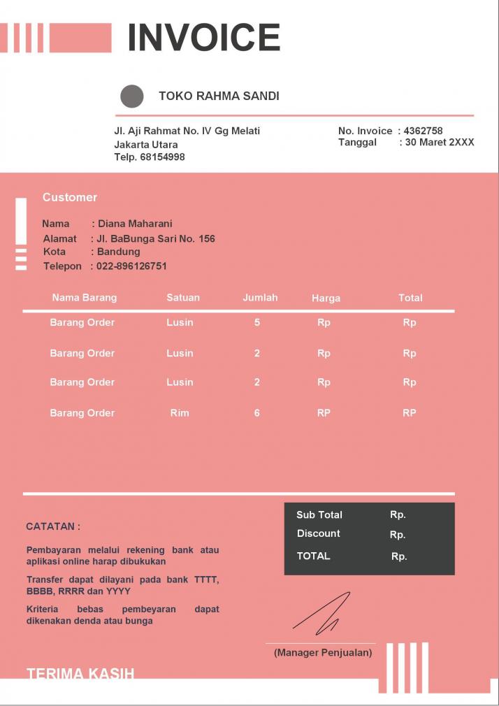 This template is designed with a pink color scheme and offers a basic layout for invoicing services. It includes fields for client information, date, description of services, and the amount charged.