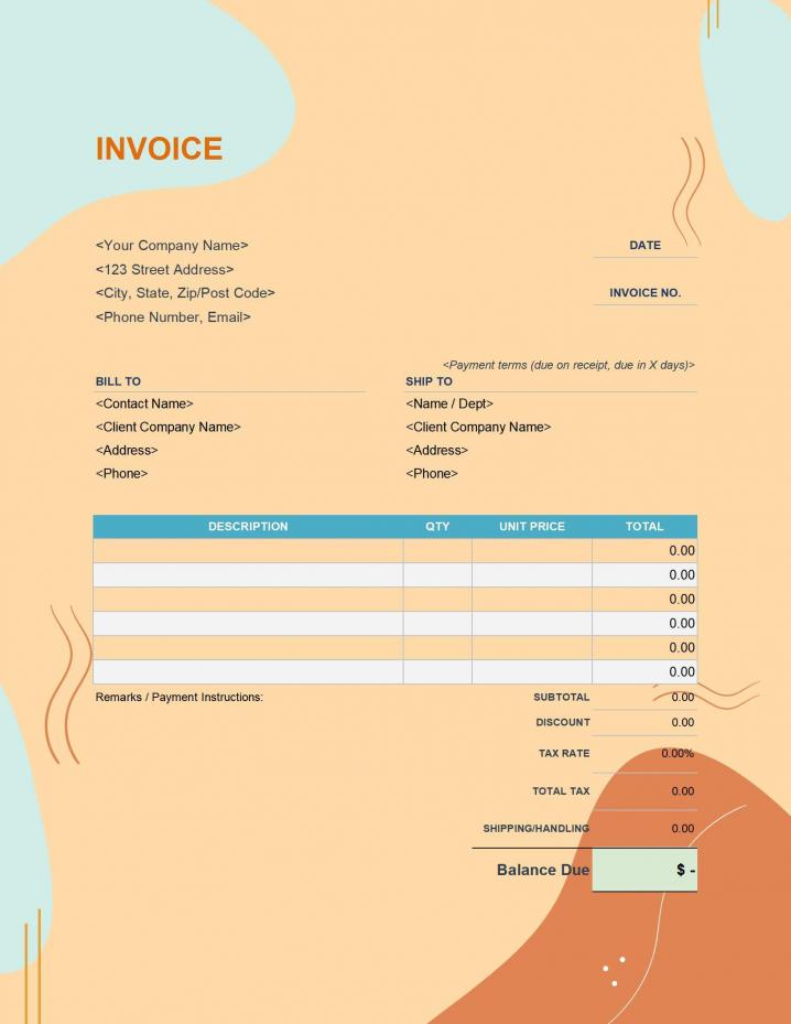This template offers a modern design with a bright orange color scheme. It includes fields for the company name, address, and logo and allows for customization of the invoice layout. It's ideal for businesses that want a modern and professional-looking invoice.