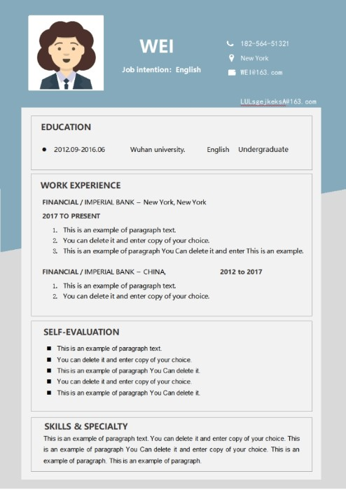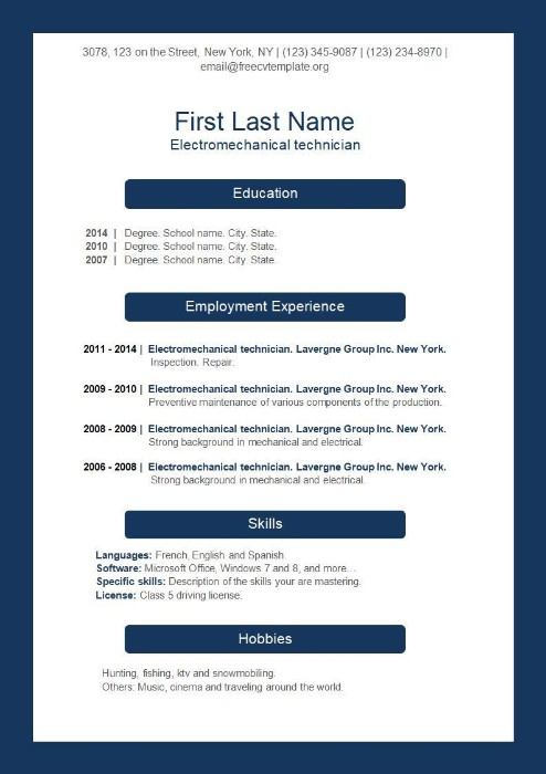 This resume format features a simple and professional design with a blue color scheme.