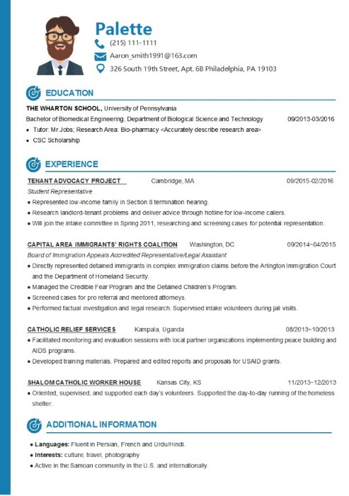 This resume template features a simple design with a blue color scheme.