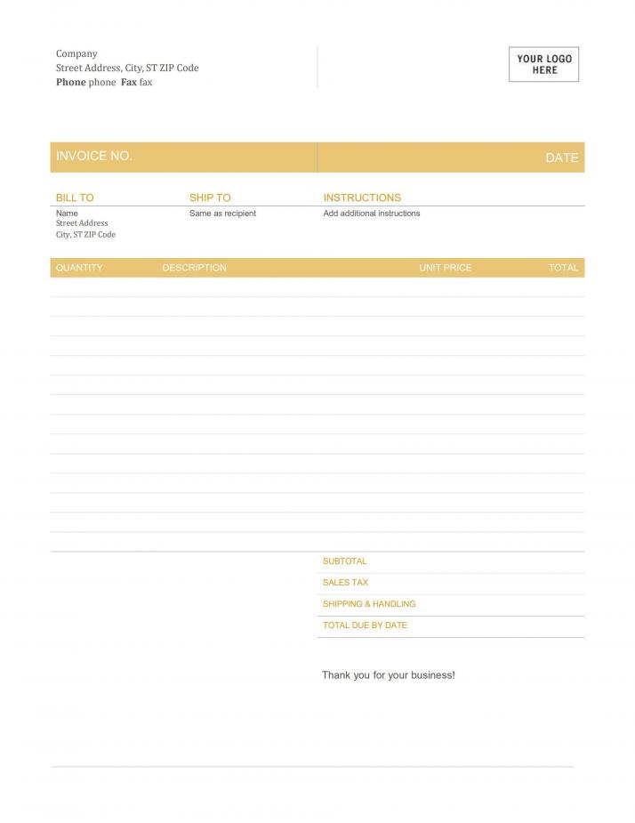 This template features a simple yellow design with space for the business name and logo, customer information, a description of the product or service, and the total amount due. It also includes sections for payment terms and a thank you note.