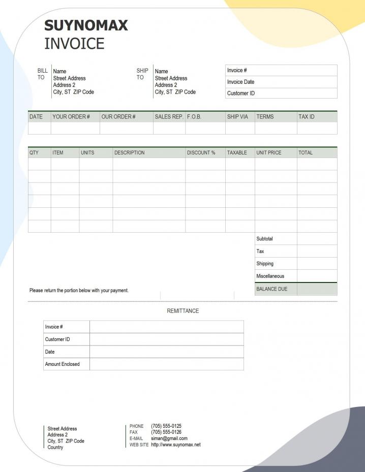 This template features a fresh green design with all the necessary invoice fields. It includes customer information, an itemized list of products/services provided, invoice number, date, due date, tax information, and payment terms.