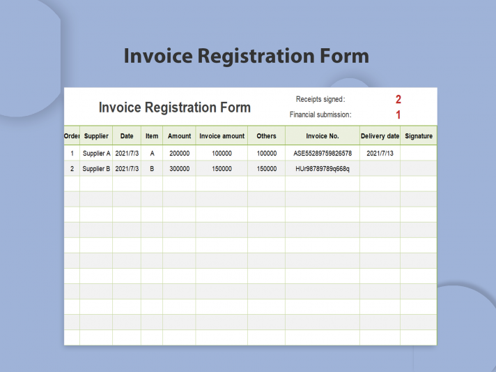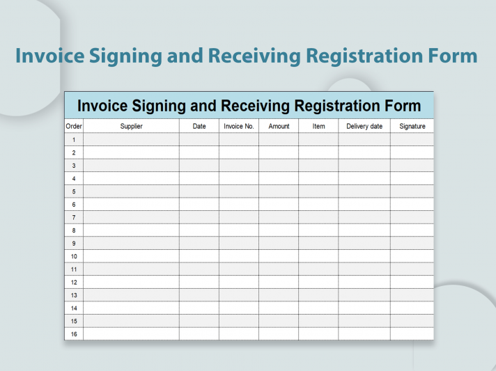 Invoice Signing and Receiving Registration Form.xlsx is an Excel template that helps users track the receipt and signing of invoices. It includes fields for the invoice number, date, vendor name, recipient name, and date signed.
