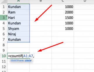 In the context of the above example, you need to apply the COUNTIF function under cell B1.