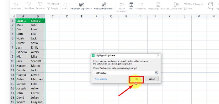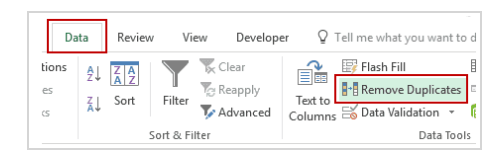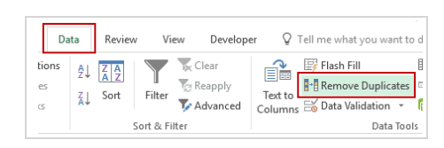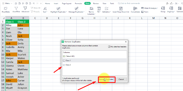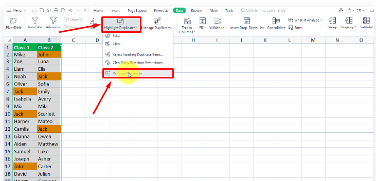 Step 5. After comparing the two columns, you want to remove the highlighted duplicates, select the data area, and then click the Data tab > Highlight Duplicates > Remove Duplicates. You need to know the columns you want to remove from your data to remove the duplicates.