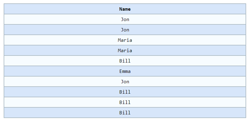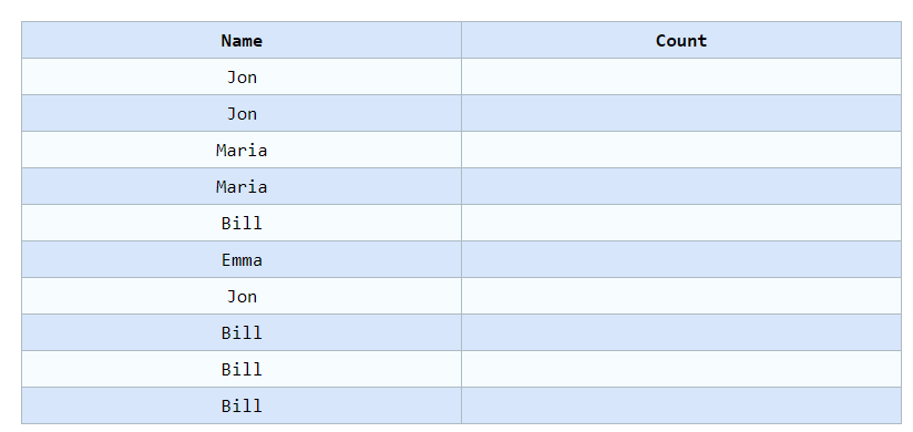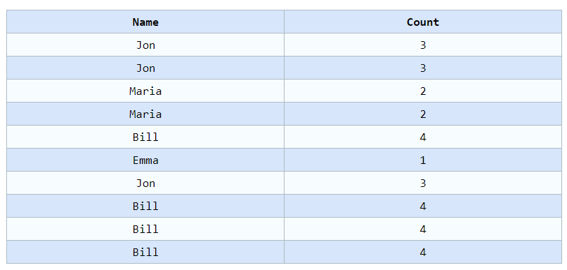 Step 1. To start with, you have to prepare the data containing the duplicates. Let's say that you have prepared the data below, in which you can see the duplicates. A goal is to count the times each name is present in the table.