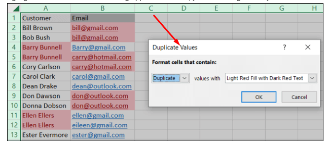 Step 3. In the third step, when you see that the Duplicate Values window displays, you should immediately see your duplicates highlighted with the default formatting applied.