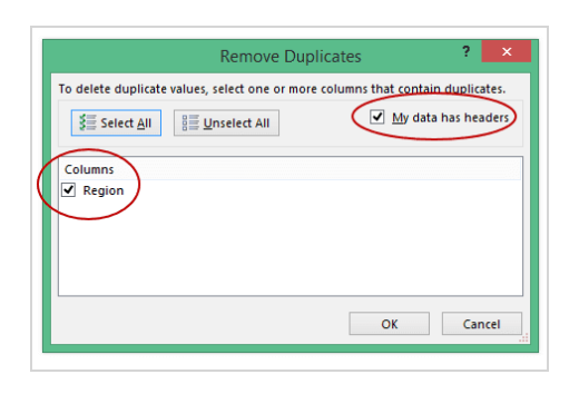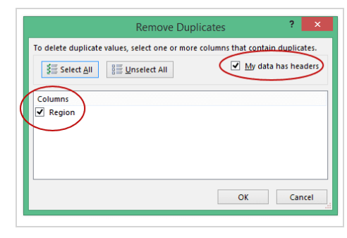 In the remove dialogue box, if your data has a header, you need to ensure that the My data has headers option checked. And also, make sure that the column is selected. Then click Ok.