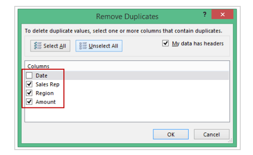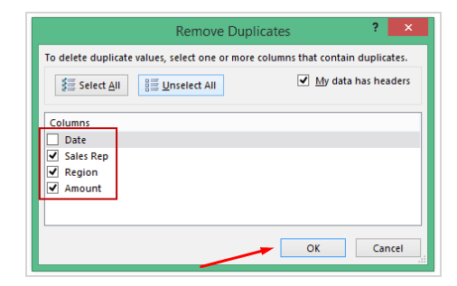 In the Remove Duplicate Dialogue box, ensure the My data has headers option is checked. Select all columns except the date column. Then click Ok.