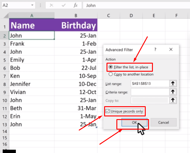In the next step, you must check the Filter the list-in place and click on the Unique records only. Finally, click on Ok. After doing all these steps, you can get the unique record values in the column of your data.