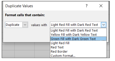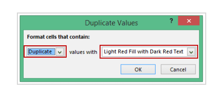 Step 3. In the third step, open the Duplicate Values box, select Duplicate on the dropdown on the left, and specify the format to highlight the duplicate values.