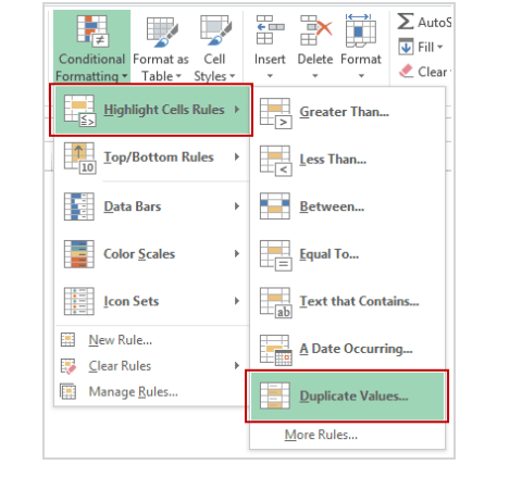 Step 2. The next step is to go to the Home tab and the Styles section of the ribbon. Then, you need to click Conditional Formatting, move to Highlight Cell Rules, and choose Duplicate Values in the pop-out menu.