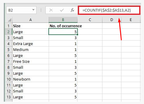 Step 2. Enter the ‘B2’ Cell formula in the second step. You need to enter =COUNTIF($A$2:$A$13,A2)