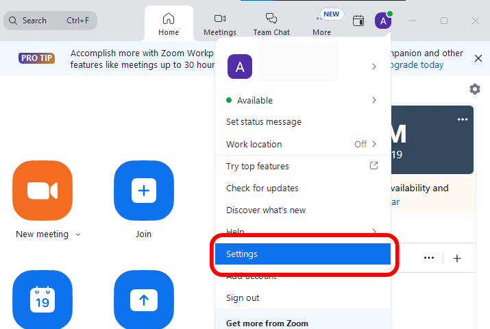 Step 1: In the Zoom desktop application, click on your profile icon in the top-right corner and select “Settings”.