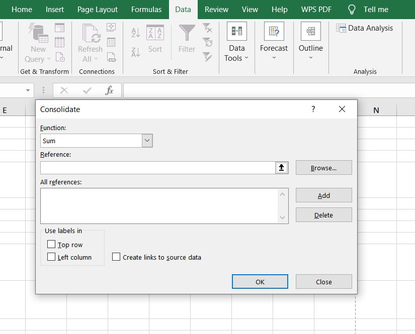 select the function in the In the "Reference" field, select the range of cells you want to consolidate.
