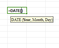 Type "=DATE(" and provide the year, month, and day as separate arguments or cell references.
