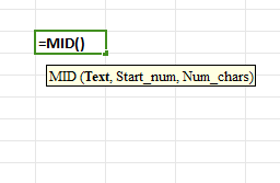 Type "=MID(" and provide the cell reference or text, the starting position, and the number of characters to extract.