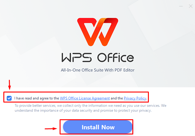 Step 2: Once done with clicking on download, it asks for installation on your PC, so click on the Install Now option after agreeing on the WPS office policy license.