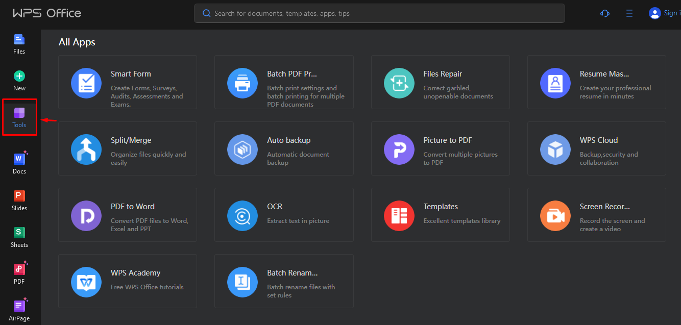 Step 5: In the main home screen of the WPS Office suite, you can see that there are additional tools that can help you process easily, making your work more professional.