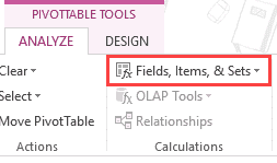 Step 2: Go to Pivot Table Tools –> Analyze –> Calculations –> Fields, Items, & Sets.