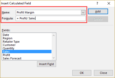 In the Formula field, create the formula you want for the calculated field. Note that you can choose from the field names listed below it. In this case, the formula is ‘= Profit/ Sales’. You can either manually enter the field names or double click on the field name listed in the Fields box.