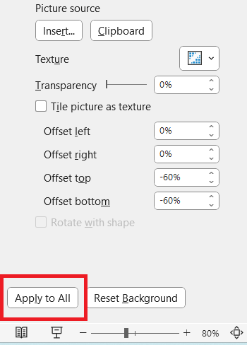 Step 7: By default, the selections you make apply to the current slide. If you want them to apply to all slides in your file, at the bottom of the pane, select Apply to All.
