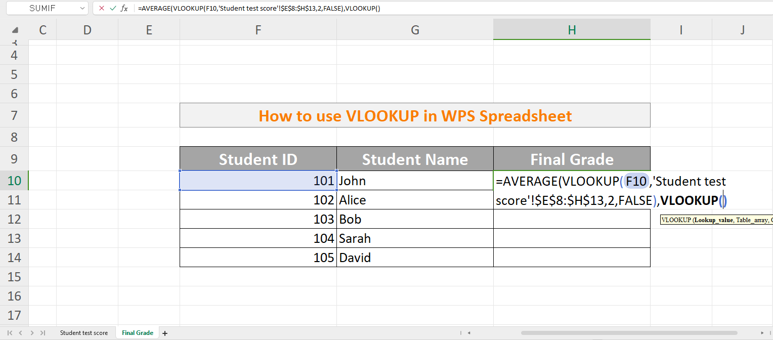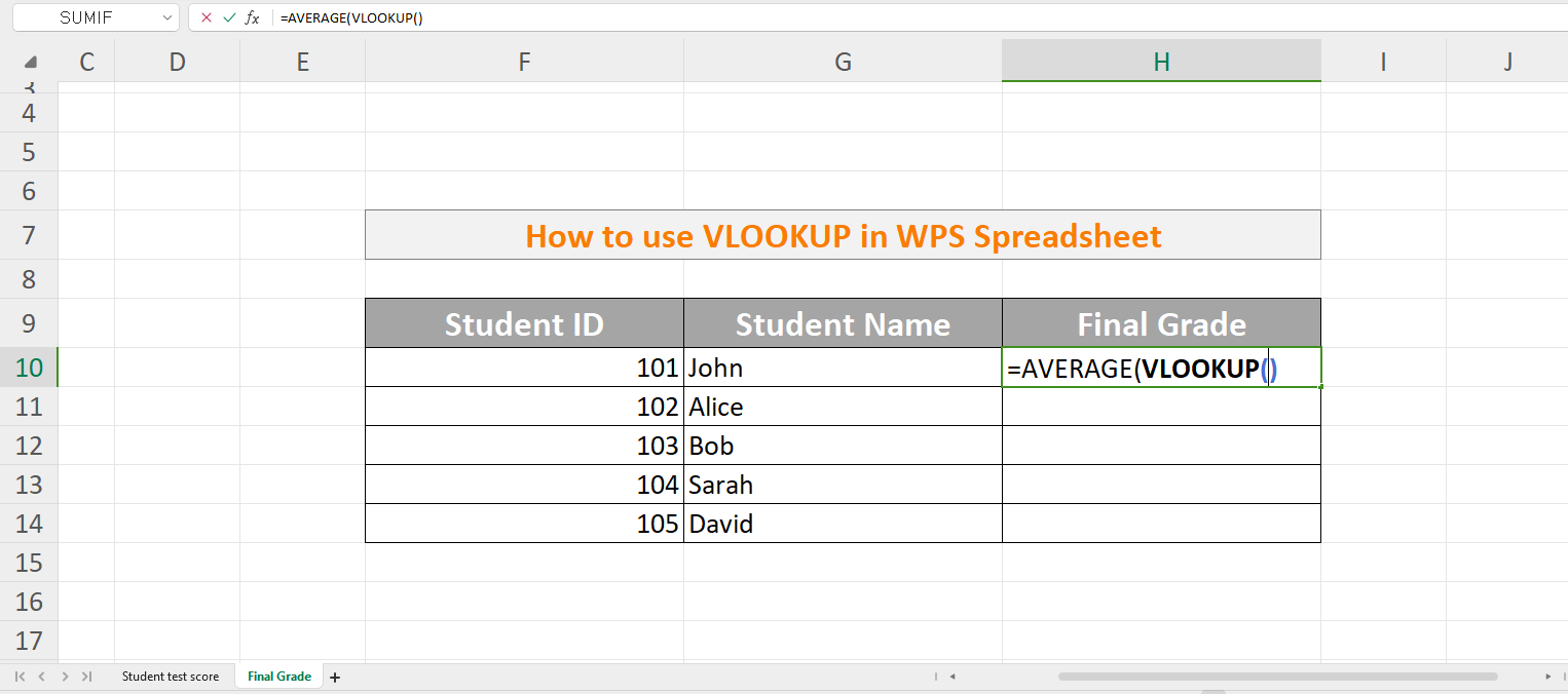 Let's explore a unique example of how to use the VLOOKUP function in WPS Office, combined with the AVERAGE function. We'll be creating a spreadsheet to calculate the final grade for students, which we'll call the "Final Grade".