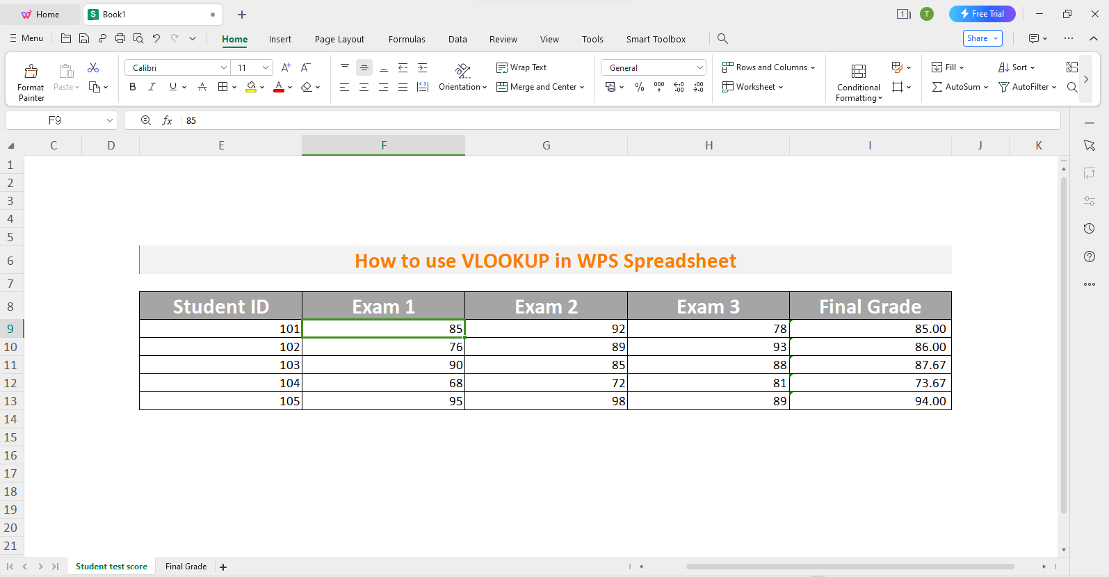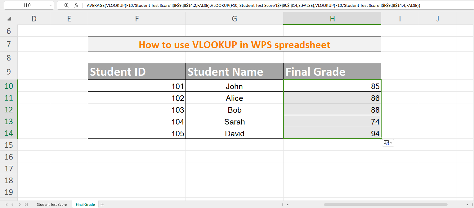 And there you have it, the final grade calculated using the VLOOKUP function nested within the AVERAGE function. What's noteworthy is how WPS Spreadsheet simplifies a potentially lengthy and complex process with these additional features. Try WPS Spreadsheet for yourself; this tool can be a valuable asset for your spreadsheet tasks.