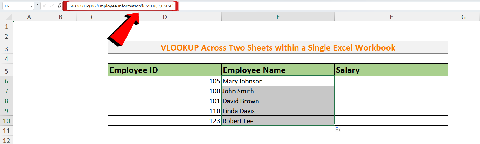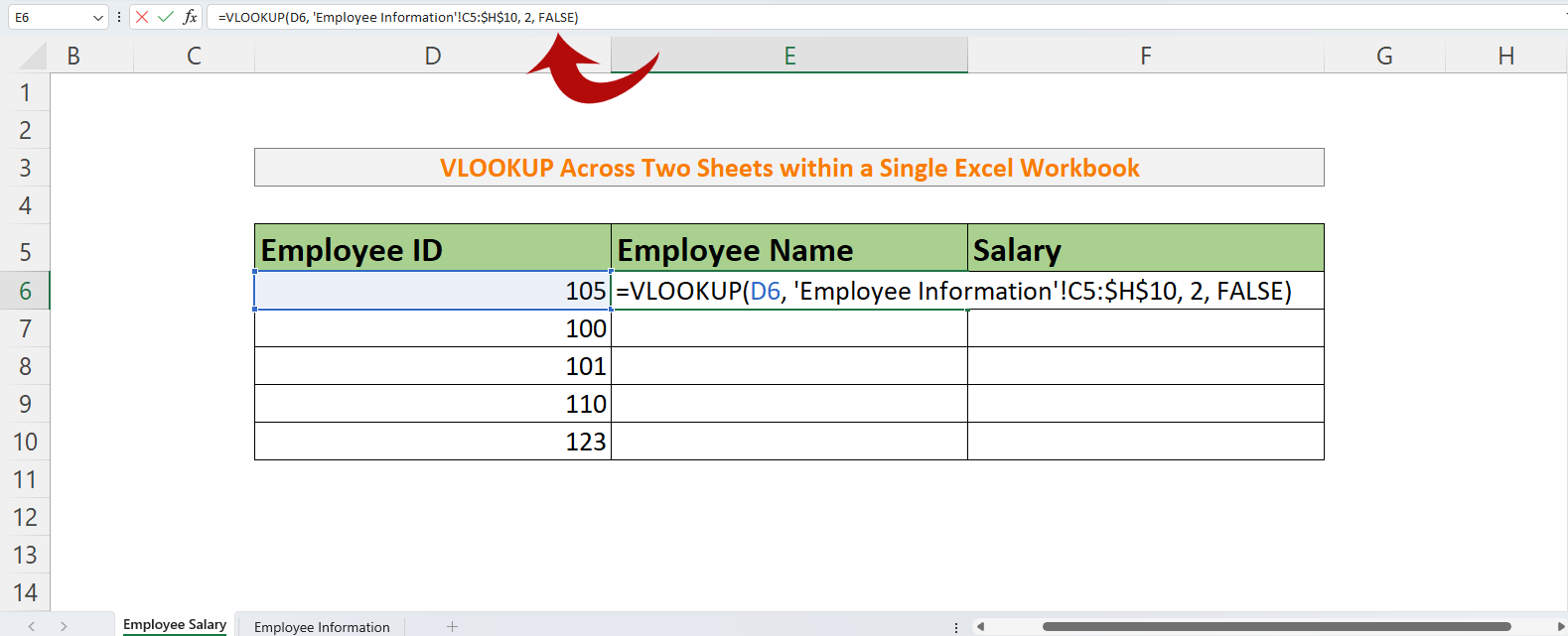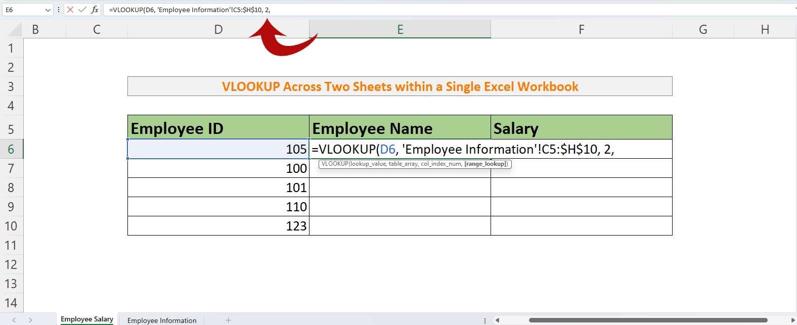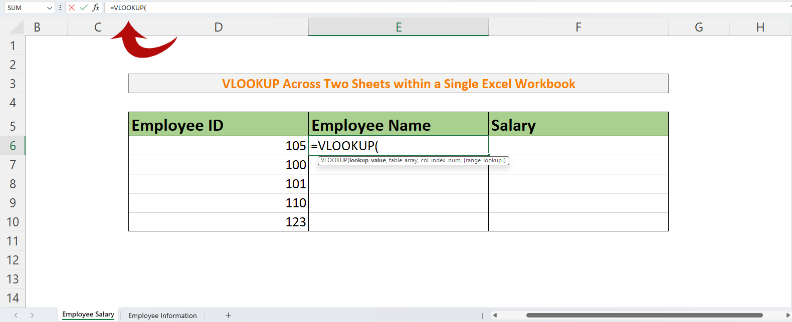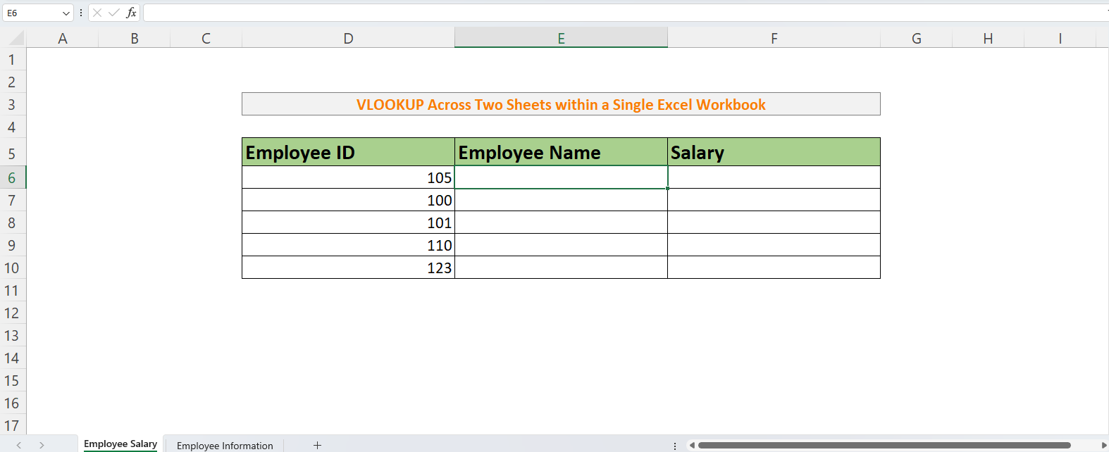 Let's head over to the "Employee Salary" sheet, where we will deploy the VLOOKUP Function. In cell E6, we will try to fetch the name which corresponds to Employee ID "105" from cell D6.