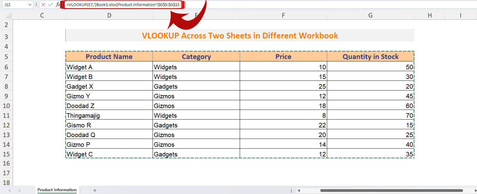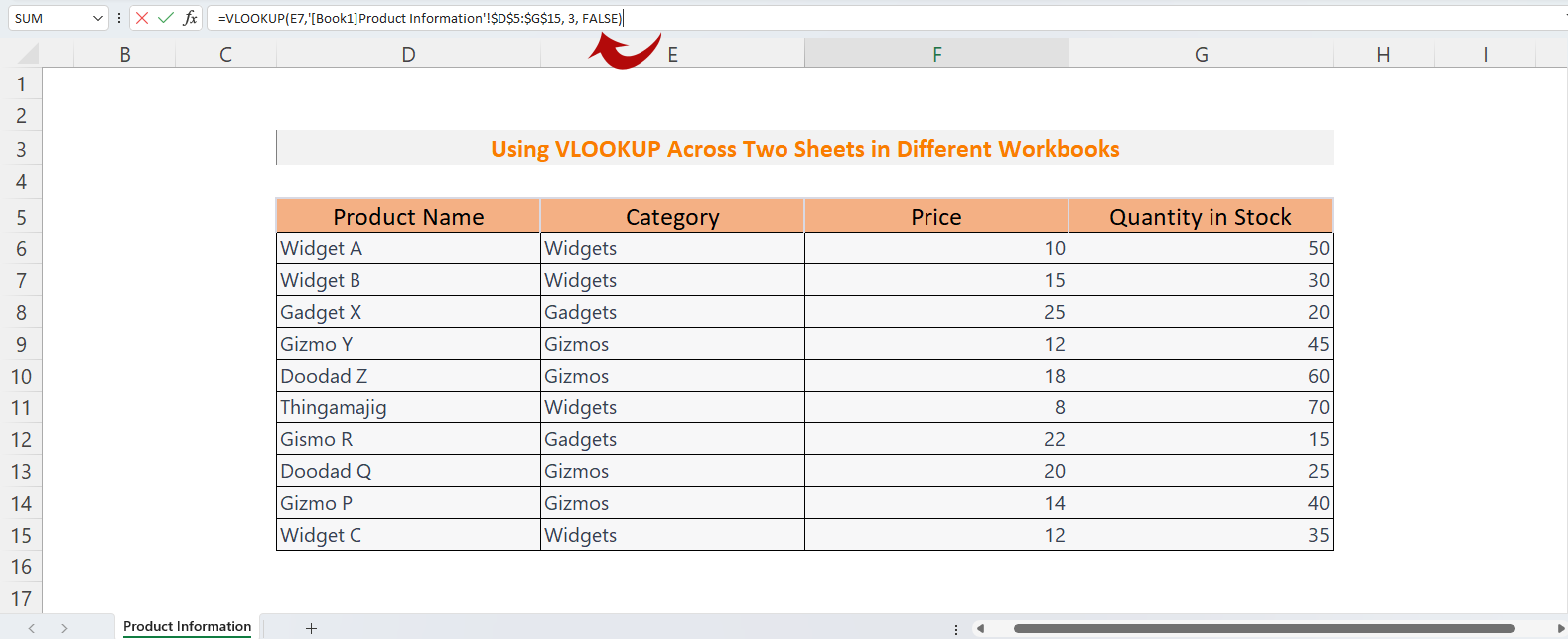 Open Workbook 2 and navigate to the sheet where you want to display the product prices. In cell F7, we will use VLOOKUP to fetch the price of a specific product.