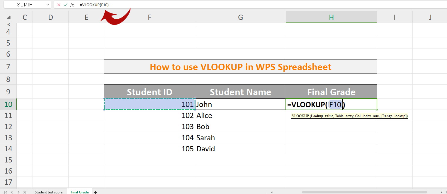 Step 3: Similar to our VLOOKUP earlier, the student ID will be the lookup_value. Select cell F10.