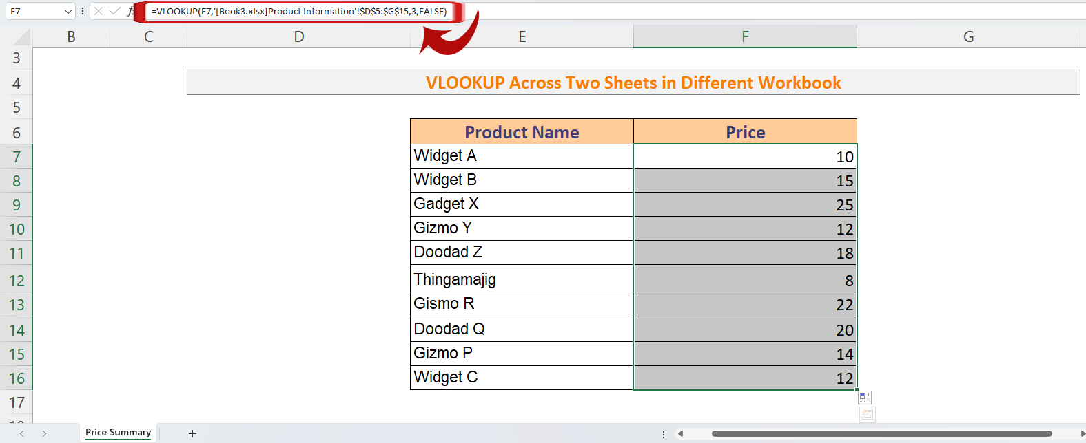 Step 6: Your VLOOKUP function is now complete. Press "ENTER", and Excel will perform the VLOOKUP function between the two workbooks, extracting the price of "Widget A" into cell B2.