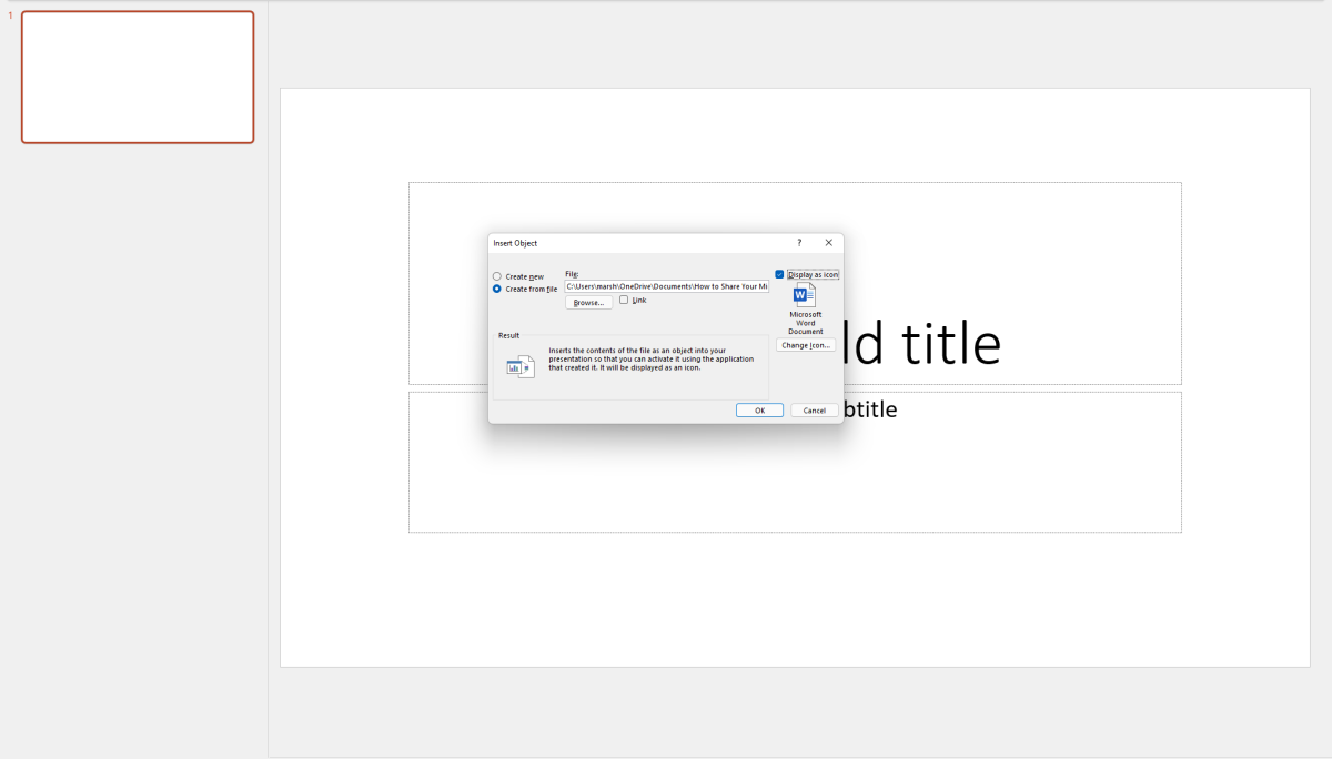 If you choose to embed the object in your presentation, the information it contains becomes part of the presentation itself. This is helpful if you're concerned about the Word document moving around (which can cause issues for linked objects), but it might make your presentation file larger.
