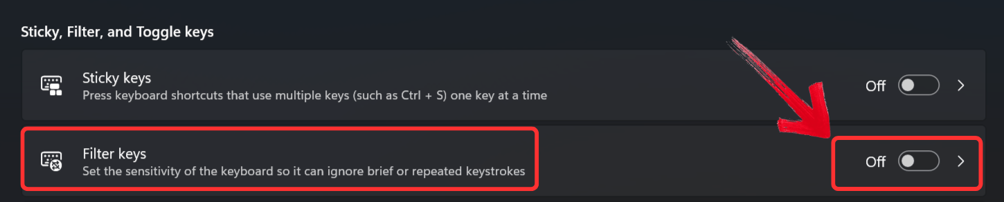 When Filter Keys is enabled, it can delay the response from the keyboard. Turning it off should immediately fix the problem for many users, especially if the issue is related to lag in keystroke recognition.