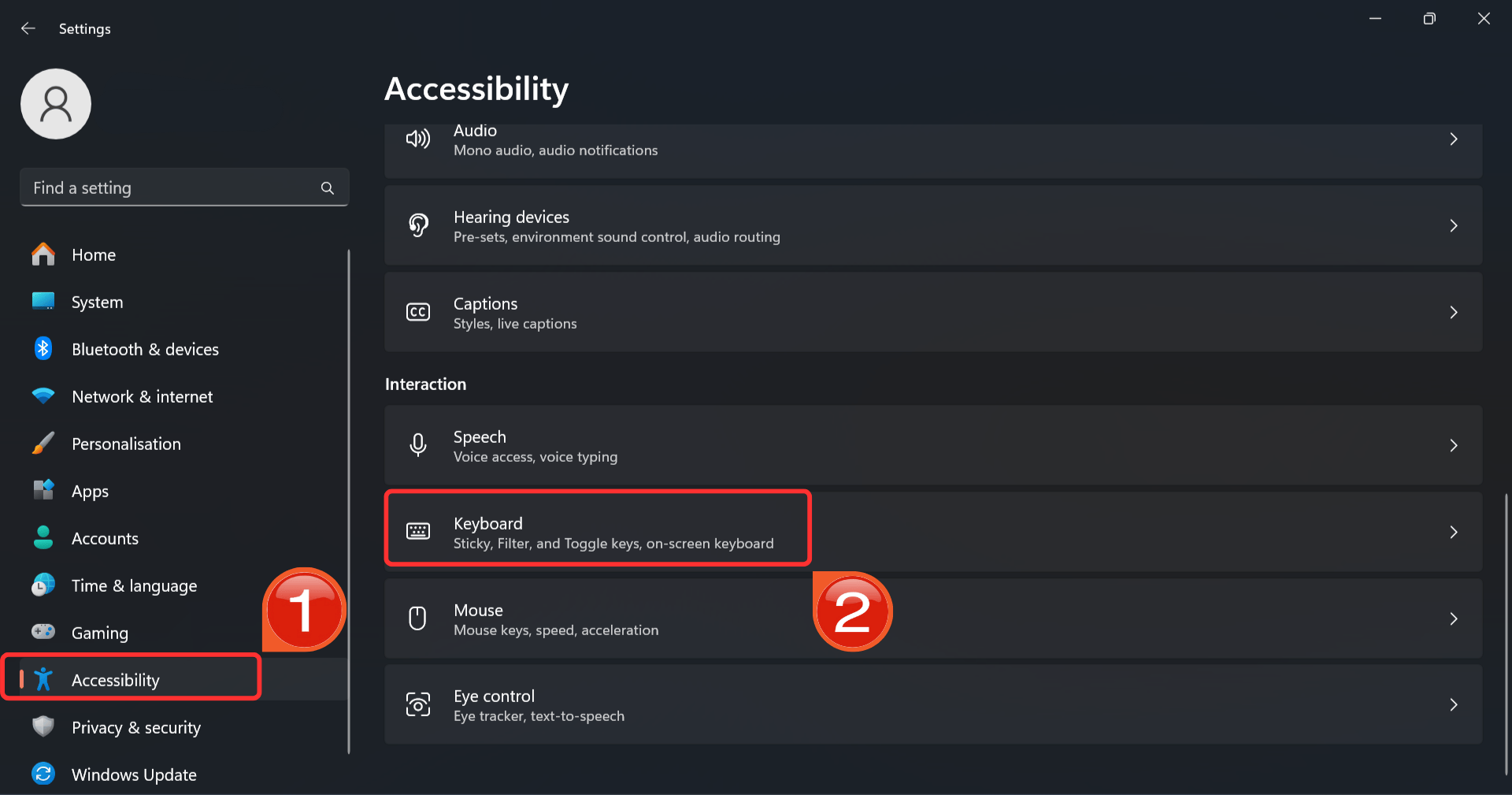 Step 2: Then, go to click accessibility, then scroll down and click on keyboard.
