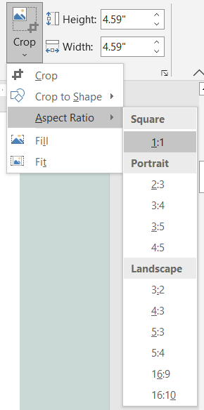 Step 5: In case your original image doesn't crop into a perfect circle due to aspect ratio, don't fret. Click on the small arrow under the Crop icon, then choose "Aspect Ratio" and select "1:1."